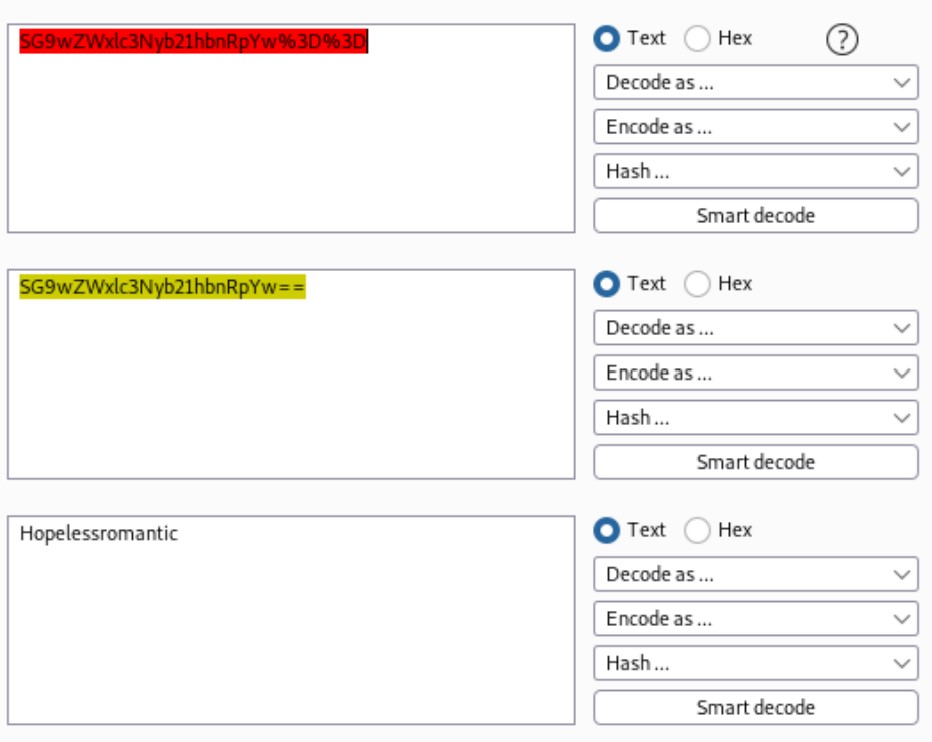 By decoding the values, we get the creadentials admin:Hopelessromantic.