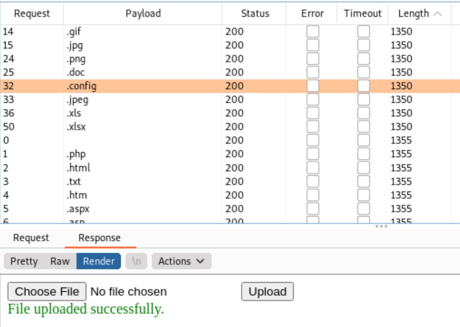 After a while of fuzzing, we see a few responses with a different length. By looking into the response content, we have confirmed that these file types are allowed to upload. In the results, what makes us really curious is that we can upload .config files.