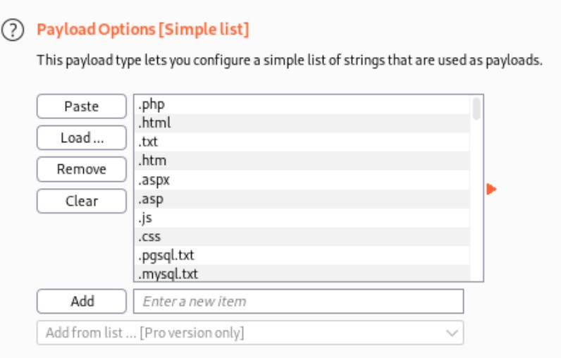 To find out what extensions are allowed, we intercept the request with burp, and then send it to intruder. In Positions tab, we specify where the payload should be injected, which is the file extension. In Payloads tab, we choose /usr/share/seclists/Discovery/Web-Content/raft-small-extensions-lowercase.txt as our wordlist.