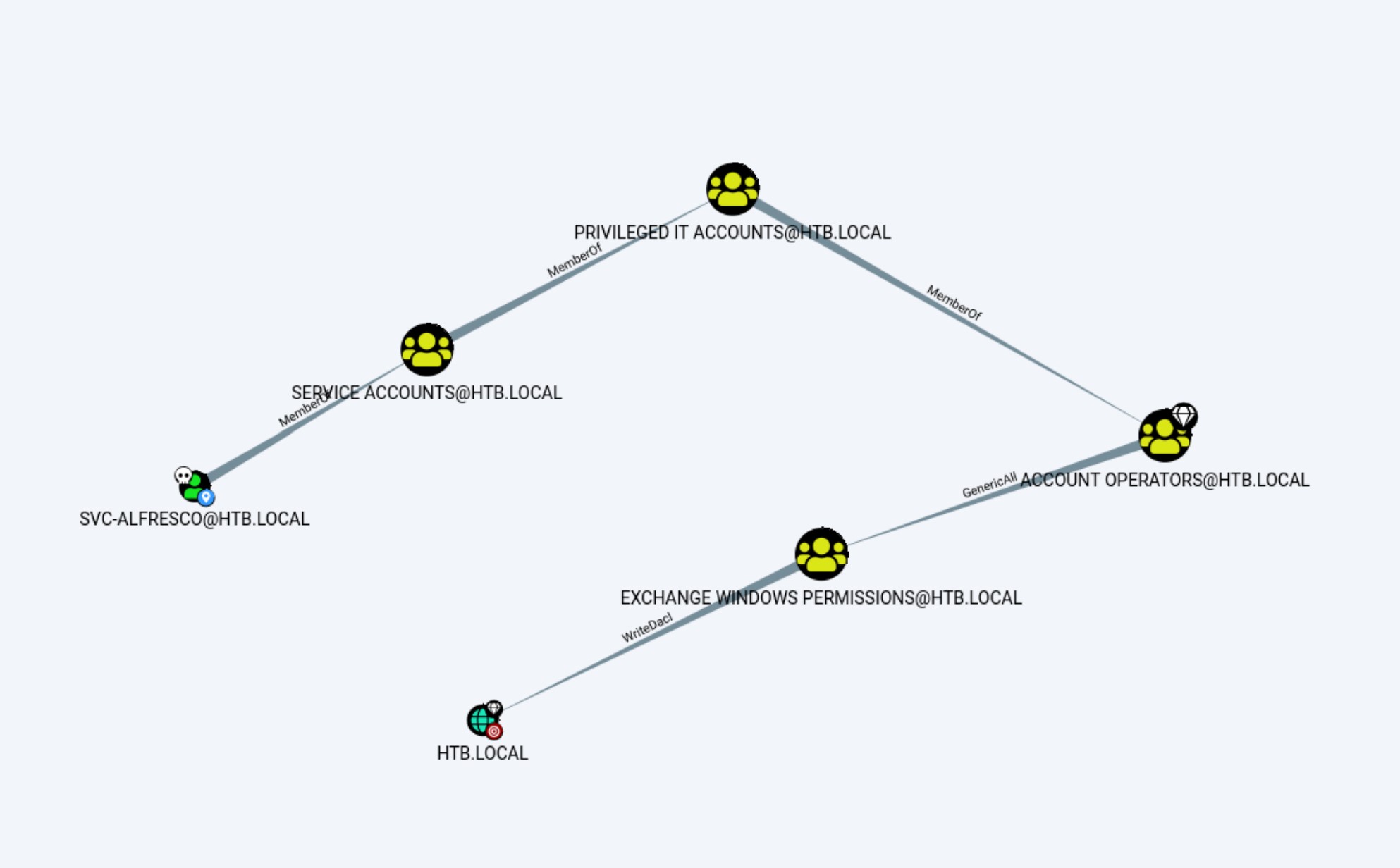 By doing this, we get a few json files. Next, we drop these files into BloodHound. After the data is processed, we query “Shortest Path from Owned Principals”, and “Shortest Paths to High Value Targets” respectively. From the first query we we can see that svc-alfresco, which is already owned by us, is eventually a member of “Account Operators”. This means that we can create users and add them to normal groups. Combining it with the second query, we find a PE path as the following: