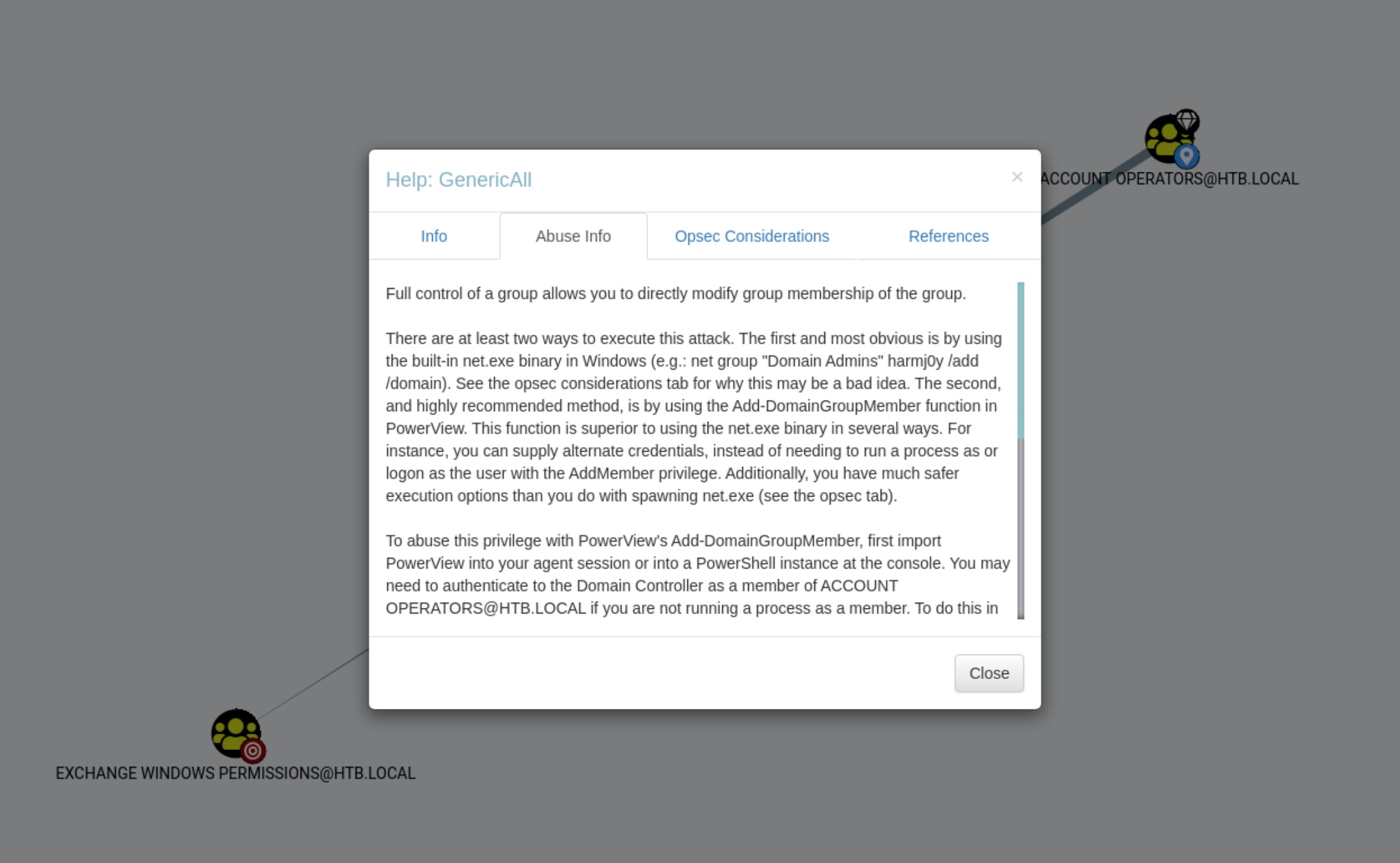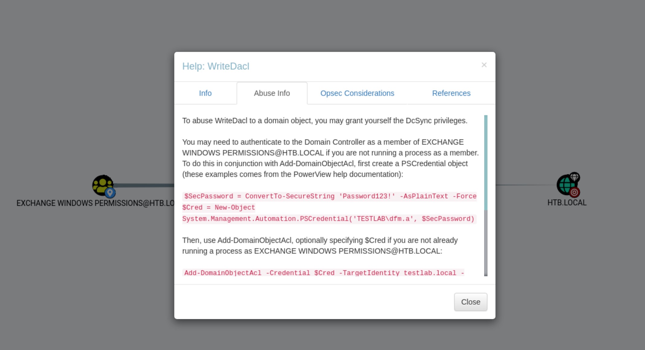 In the second step, we will use Add-ObjectACL from PowerView.ps1 to grant us DCSync Privileges. We are able to do this because we are now in the “Exchange Windows Permissions” group. More details of this attack can be found here.